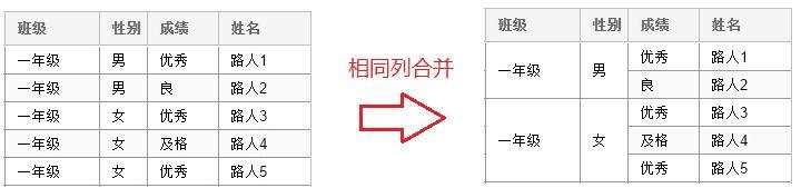 1) 比较第一行tr与第二行tr的某个td的值,若两行的值相等:设置第一行tr的td的rowspan属性的值+1;设置第二行tr的td隐藏。