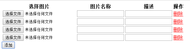 var trcomp="<tr><td><input type='file' name='imageFile'/></td><td><input name='imageName'></input></td><td><input name='note' /></td><td><a href='javascript:;' onclick='deleteCurrentRow(this);'><font color='red'>删除</font></a></td></tr>";