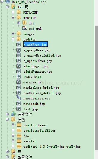 (1)首先建立以个项目,在此命名为Demo_08_NewsRealese,项目布局结构如下图所示,根据如下布局对项目进行布局设计,方便后面的编程,项目中web-inf为项目配置文件夹,images文件夹用于储存项目中使用的图片文件,ueditor为百度富文本编辑器文件夹,源包文件夹为Java类文件夹: