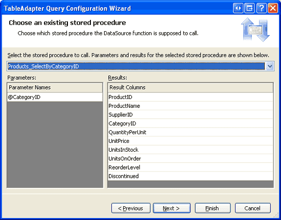 注意:我们刚才添加FillByCategoryID 和 GetProductsByCategoryID方法,执行一个int类型的输入参数,它由@CategoryID传递进来。如果你要改动Products_SelectByCategory存储过程的参数的话,你也必须更新这些TableAdapter方法的参数.就像在前一篇文章探讨的一样,要么手动添加或删除参数集里的参数,要么再次运行TableAdapter向导.