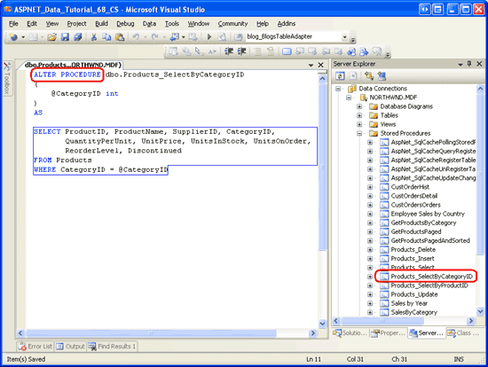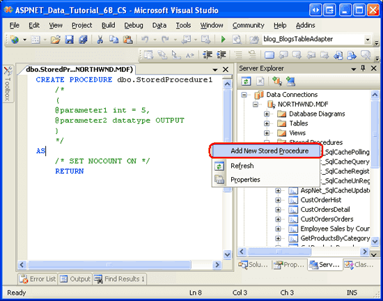 在前面的文章里我们考察了如何让TableAdapters向导自动的创建存储过程.而在本文,我们将考察如何让TableAdapter使用现有的存储过程。由于Northwind数据库现有的存储过程很少,我们也需要考察如何在Visual Studio环境里手动向数据库添加新的存储过程.