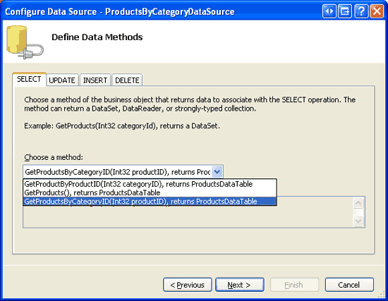 该BLL层方法仅仅通过ProductsTableAdapter的 GetProductsByCategoryID()方法来返回ProductsDataTable。由于使用了DataObjectMethodAttribute属性,我们使用ObjectDataSource的设置数据源向导时,该方法会出现在SELECT标签的下拉列表中.