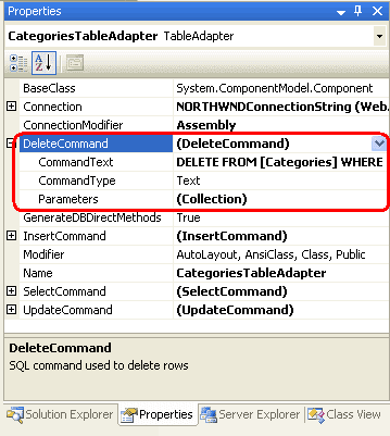 打开Northwind数据集,选中CategoriesTableAdapter并打开其属性窗口,该窗口列出了该TableAdapter用到的InsertCommand, UpdateCommand, DeleteCommand, 以及SelectCommand,以及name和数据库连接信息.展开DeleteCommand属性查看其细节.如图15所示,DeleteCommand的ComamndType属性被设置为Text, 其文本信息作为一个ad-hoc SQL查询.