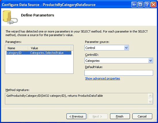 图11:设参数categoryID来源于ID为Categories的DropDownList控件