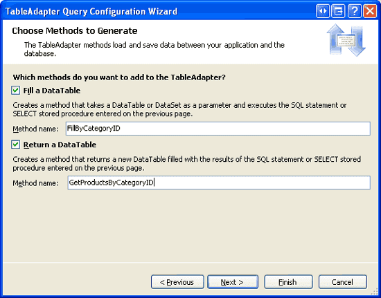 然后需要指定采用的方法模式以及方法的名称.同时选中Fill a DataTable” 和 “Return a DataTable”项.将这2个方法重命名为FillByCategoryID和 GetProductsByCategoryID. 点Next,确认无误的话,再点Finish完成设置。