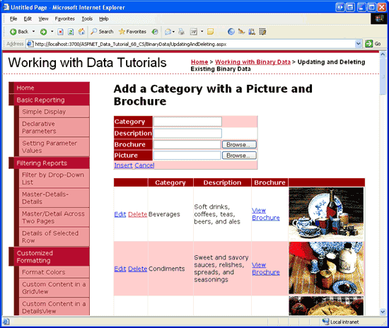 让我们看一个实实在在的例子。在Categories表和Products表之间有一个外键约束,这意味着,Products表里的CategoryID列必须要与Categories表里的CategoryID值吻合.如果某个category有对应的product,而我们试图删除该category时将会导致违背外键约束.我们来进行演示,登录这个页面(~/BinaryData/UpdatingAndDeleting.aspx),该页面列出了系统里的所有category,且每行都包含Edit和Delete按钮(如图13),如果你尝试删除一个有对应product的category时,比如Beverages——删除失败,因为违背了外键约束(如图14所示).