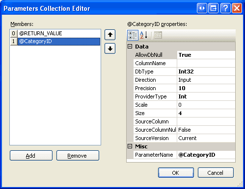 让我们来作一些修改.选中“(DeleteCommand)”文本,然后在下拉列表里寻(New)”,这将清除掉CommandText, CommandType,Parameters属性的设置。接着将CommandType属性设置为StoredProcedure,然后在CommandText属性里输入存储过程的名称(即dbo.Categories_Delete).如果你是按照先设置CommandType属性再设置CommandText属性的顺序的话,Visual Studio将自动生成Parameters collection(参数集).如果你没有按照这个顺序来的话,你就只能点击Parameters属性里的一个椭圆型的区域来打开Parameters Collection Editor对话框,手动添加参数.不管是自动的还是手动添加参数,我们都应该打开Parameters Collection Editor对话框以检查参数是否正确(如图16).如果你在对话框里没看到任何的参数,那么就手动添加参数@CategoryID,(你不需要添加参数@RETURN_VALUE).