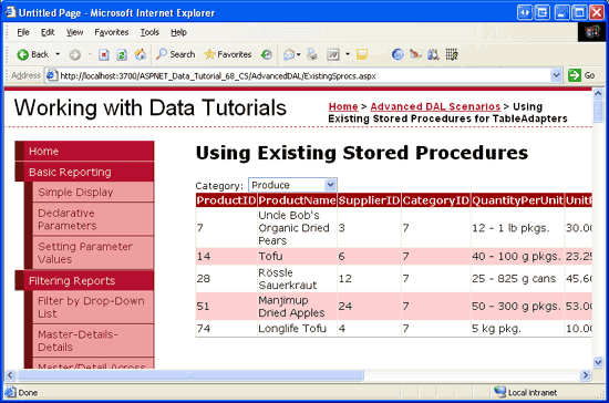 为测试新添加的Products_SelectByCategoryID存储过程,以及DAL 和 BLL层里的对应的方法, 我们将创建一个ASP.NET页面,该页面包含一个DropDownList控件以及一个 GridView控件.DropDownList控件列出数据库里所有的category,当选定某个category时,我们将在GridView里将属于该category的所有product展示出来.