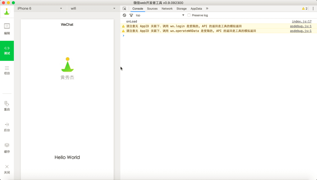 5.右边是调试窗口,有2个警告,是由于没有AppID导致的,可以暂时忽略,不影响开发。