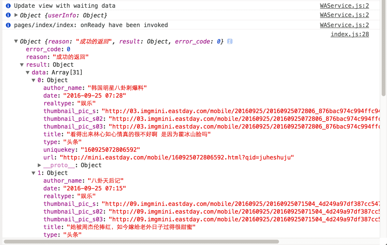 2.相应地在index.js文件的onLoad方法中加入如下代码来获取网络数据