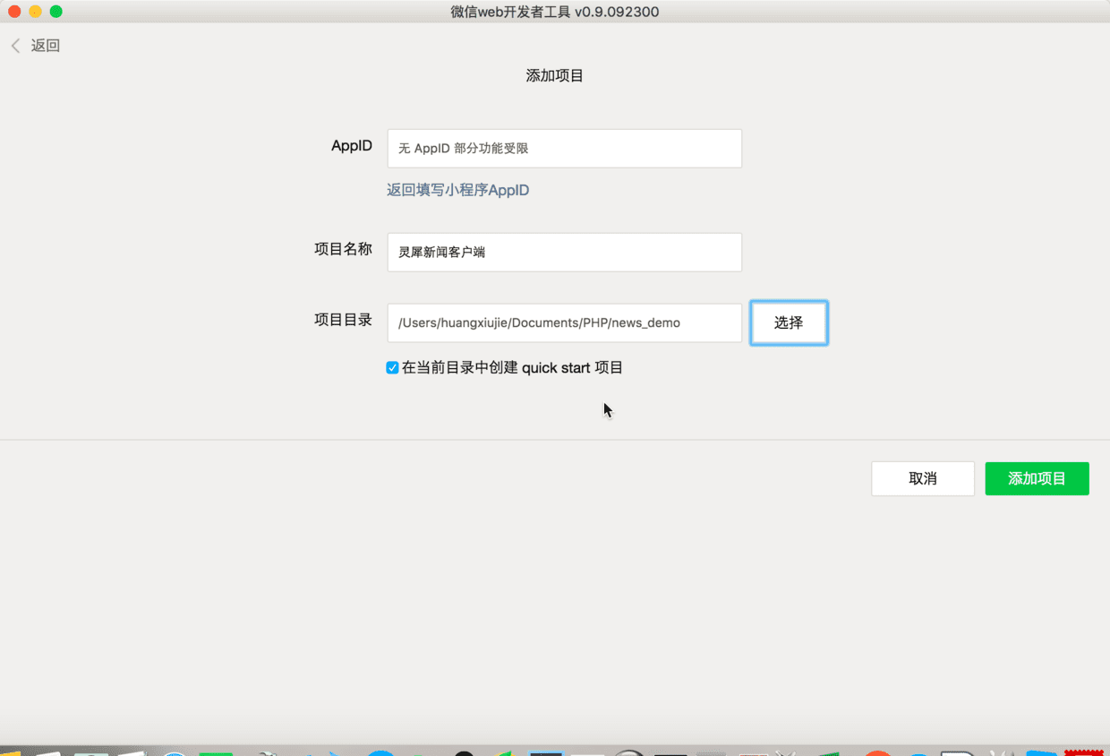 3.项目名称任意,设置好目录,勾上当前目录创建quick start项目。如图: