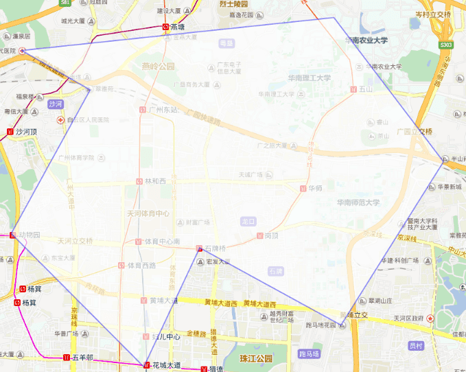结果:广州东站坐标(113.330908, 23.155678)在区域内