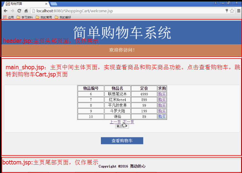 (5)进入welcome.jsp购物首页页面后,点击下一页和上一页按钮,可以查看当前商品信息;同一商品点击一次购买按钮实现购买一件商品,点击多次则实现购买多件商品;点击查看购物车按钮,实现内部跳转到Cart.jsp购物车页面,可以产看当前购买商品编号、名称、价格、购买数目以及所有商品总价格信息,并提供删除已购买商品和添加已购买商品数目功能;