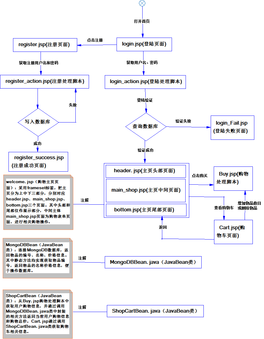 (4)在首页login.jsp页面输入用户名和密码,请求发送到login_action.jsp登陆处理脚本页,数据匹配成功跳转到welcome.jsp购物首页页面,否则跳转到登陆视频login_Fail.jsp页面;
