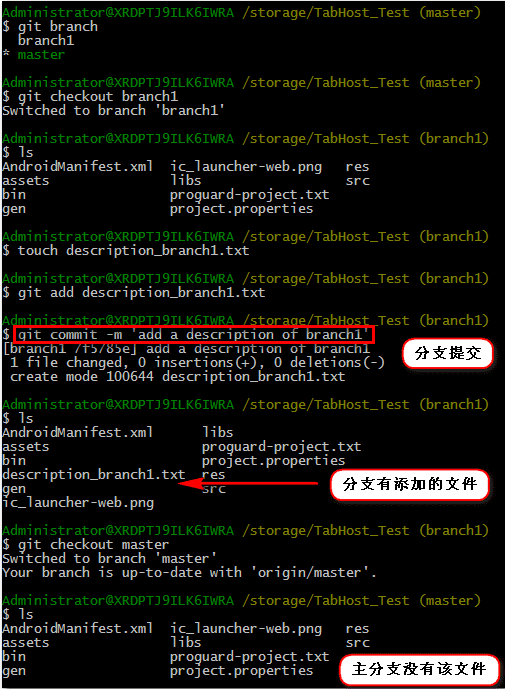 -- 主分支会影响其它分支 : 在切换回 branch1 分支中, 发现存在 description_master.txt文件;