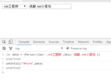 <div id="form"> <select data-field='Person.Job'> <option value="">--职位--</option> <option value="java工程师">java工程师</option> <option value="net工程师">.net工程师</option> <option value="python工程师">python工程师</option> </select> <input data-field='Person.Desc' type="text" /> </div>