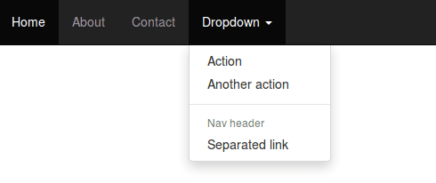 <h3>导航栏</h3> <nav class="navbar navbar-inverse navbar-fixed-top"> <div id="navbar" class="navbar-collapse collapse"> <ul class="nav navbar-nav"> <li class="active"><a href="#">Home</a></li> <li><a href="#about">About</a></li> <li><a href="#contact">Contact</a></li> <li class="dropdown"> <a href="#" class="dropdown-toggle" data-toggle="dropdown" role="button" aria-expanded="false">Dropdown <span class="caret"></span></a> <ul class="dropdown-menu" role="menu"> <li><a href="#">Action</a></li> <li><a href="#">Another action</a></li> <li class="divider"></li> <li class="dropdown-header">Nav header</li> <li><a href="#">Separated link</a></li> </ul> </li> </ul> </div><!--/.nav-collapse --> </div> </nav>