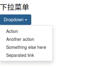 <h3>下拉菜单</h3> <div class="dropdown"> <button class="btn btn-primary dropdown-toggle" type="button" id="dropdownMenu1" data-toggle="dropdown" aria-expanded="true"> Dropdown <span class="caret"></span> </button> <ul class="dropdown-menu" role="menu" aria-labelledby="dropdownMenu1"> <li role="presentation"><a role="menuitem" tabindex="-1" href="#">Action</a></li> <li role="presentation"><a role="menuitem" tabindex="-1" href="#">Another action</a></li> <li role="presentation"><a role="menuitem" tabindex="-1" href="#">Something else here</a></li> <li role="presentation"><a role="menuitem" tabindex="-1" href="#">Separated link</a></li> </ul> </div>