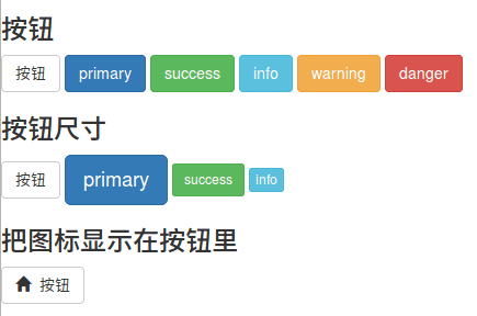 <h3>按钮</h3> <button type="button" class="btn btn-default">按钮</button> <button type="button" class="btn btn-primary">primary</button> <button type="button" class="btn btn-success">success</button> <button type="button" class="btn btn-info">info</button> <button type="button" class="btn btn-warning">warning</button> <button type="button" class="btn btn-danger">danger</button> <h3>按钮尺寸</h3> <button type="button" class="btn btn-default">按钮</button> <button type="button" class="btn btn-primary btn-lg">primary</button> <button type="button" class="btn btn-success btn-sm">success</button> <button type="button" class="btn btn-info btn-xs">info</button> <h3>把图标显示在按钮里</h3> <button type="button" class="btn btn-default"><span class="glyphicon glyphicon-home"></span>按钮</button>