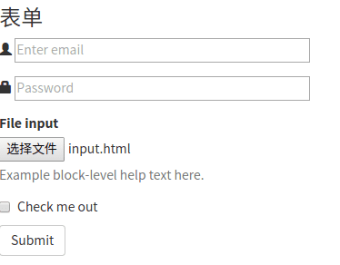 <h3>表单</h3> <form> <div class="form-group"> <span class="glyphicon glyphicon-user"></span> <input type="email" id="exampleInputEmail1" placeholder="Enter email"> </div> <div class="form-group"> <span class="glyphicon glyphicon-lock"></span> <input type="password" id="exampleInputPassword1" placeholder="Password"> </div> <div class="form-group"> <label for="exampleInputFile">File input</label> <input type="file" id="exampleInputFile"> <p class="help-block">Example block-level help text here.</p> </div> <div class="checkbox"> <label> <input type="checkbox"> Check me out </label> </div> <button type="submit" class="btn btn-default">Submit</button> </form>