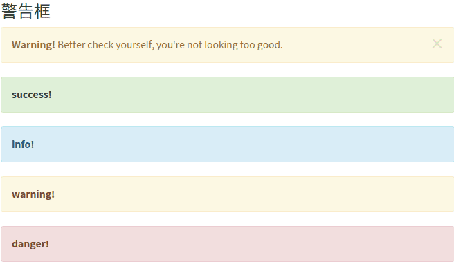 <h3>警告框</h3> <div class="alert alert-warning alert-dismissible" role="alert"> <button type="button" class="close" data-dismiss="alert" aria-label="Close"><span aria-hidden="true">×</span></button> <strong>Warning!</strong> Better check yourself, you're not looking too good. </div> <div class="alert alert-success" role="alert"> <a href="#" class="alert-link">success!</a> </div> <div class="alert alert-info" role="alert"> <a href="#" class="alert-link">info!</a> </div> <div class="alert alert-warning" role="alert"> <a href="#" class="alert-link">warning!</a> </div> <div class="alert alert-danger" role="alert"> <a href="#" class="alert-link">danger!</a> </div>