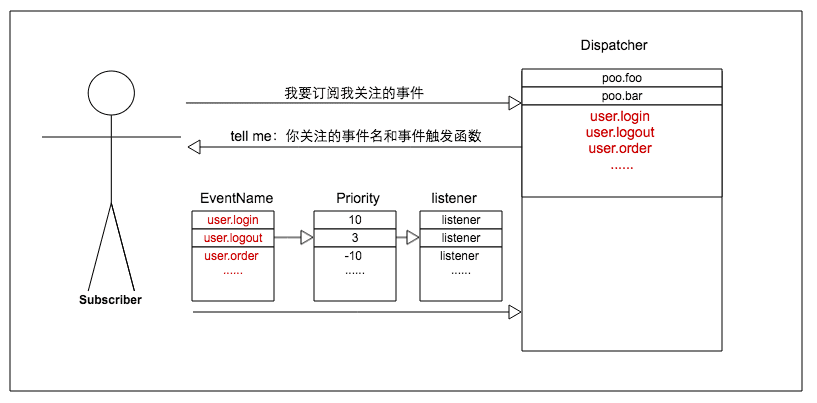 事件订阅者(Event subscriber),告诉dispathcer实例,他要订阅的所有事件,不用一个个通过dispathcer实例去注册。事件订阅者是一个PHP类,他可以告诉dispathcer他要订阅的具体的事件。