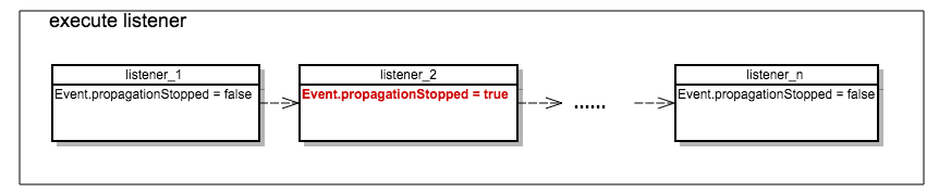 如上图所示,当触发某个时间的时候,该事件名下面如果监听了多个触发动作,他们会按照优先级、注册顺序依次触发,触发动作一般是一个可执行的“实例”(不管是类还是函数,必须可以通过call_user_func_array调用),可以传入三个参数,第一个参数(必须)是一个Event实例,第二个是触发的事件名,第三个是事件分发器实例。第一个参数会控制事件是否在该事件名下的所有触发动作之间继续传递,比如上面的linstener_2里面将Event.propagationStopped设置为true,执行完linstener_2后,事件就会停止传播,linstener_2后面的动作不会触发。