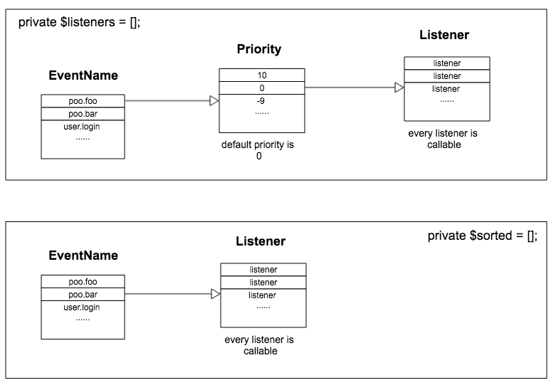 上面这张图是分析Symfony EventDispatcher组件源码得出来的,可以看到事件在系统中是如何存储的
