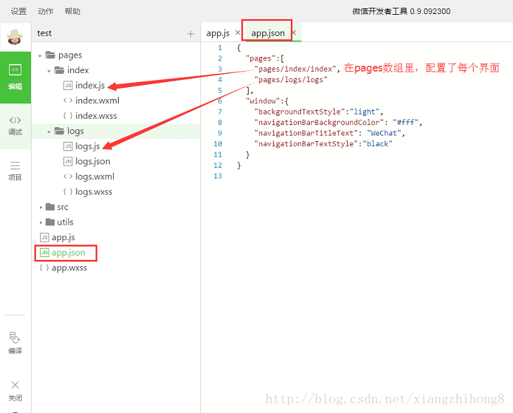 首先看下根目录下的app.json的文件,可以看到在”pages”的数组里,里面配置了每个界面,且包含了每个界面文件的目录