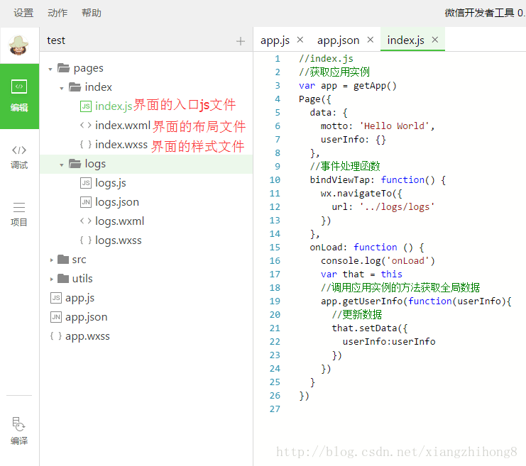 之前说过这个文件中监听并处理小程序的生命周期函数、声明全局变量,调用框架提供的丰富的 API,相当于我们写移动端时候的逻辑代码。