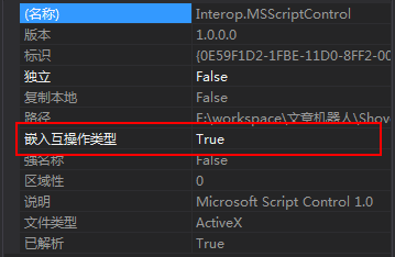 在尝试过很多方法之后仍然没有解决,包括将MSScriptControl组件的引用属性“嵌入互操作类型”设置为false,如图所示: