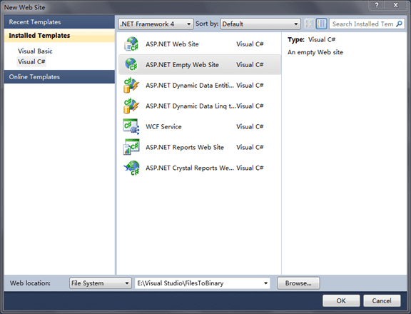 第二步:打开Visual Studio,新建一个空网站,命名为“FilesToBinary”