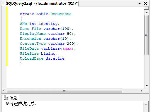 create table Documents ( SNo int identity, Name_File varchar(100), DisplayName varchar(50), Extension varchar(10), ContentType varchar(200), FileData varbinary(max), FileSize bigint, UploadDate datetime )