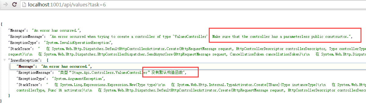 这个时候提示了个错误“没有默认构造函数”;我们刚才使用的构造函数是带有参数的,而自定义继承的 ApiController 中有一个无参数的构造函数,根据错误提示内容完全无解;不用担心,解决这个问题只需要在 WebApiConfig.cs 中Register方法中增加如下代码: