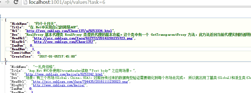 好了咋们创建一个webapi项目取名为 Stage.Api ,使用她自动生成的 ValuesController 文件里面的Get方法接口来调用咋们上面实现的博客抓取方法,代码如下: