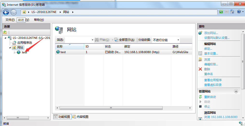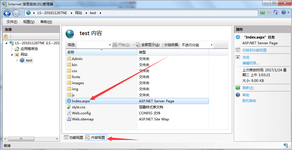 19.选中test站切换到内容视图,再选中index页面右击浏览,看看是否发布成功