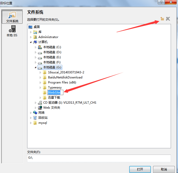 9.选择自己想要将网站放置的盘,然后点击右上角的新建文件夹图标,一定要把项目放在WebSite文件夹下!