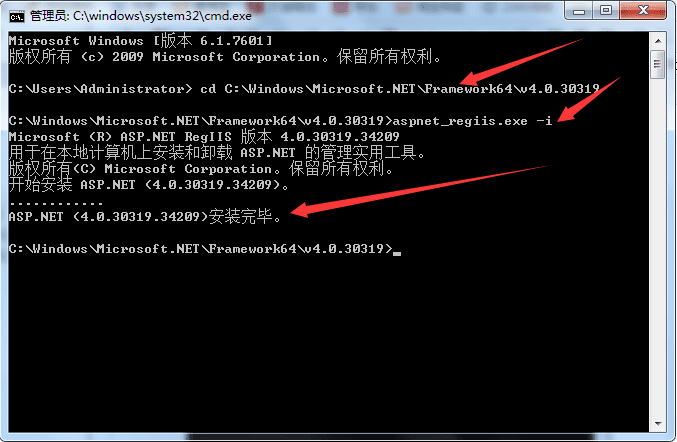 寻找路径:C:\Windows\Microsoft.NET\Framework64\v4.0.30319 ==> 复制其路径 ==> 打开cmd ==> 输入命令: cd C:\Windows\Microsoft.NET\Framework64\v4.0.30319(右键粘贴) ==> 回车 ==> 然后输入:aspnet_regiis.exe -i ==> 回车 即可安装