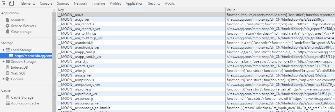 以__MOON__a/a_report.js为例,版本信息用key __MOON__a/a_report.js_ver存储,存储的value为//res.wx.qq.com/mmbizwap/zh_CN/htmledition/js/a/a_report32e586.js。
