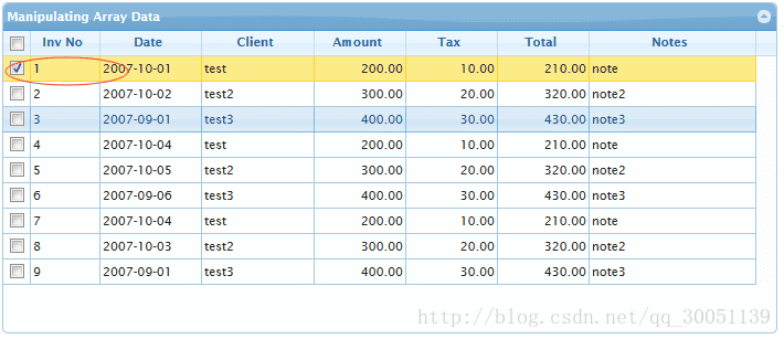 /** multiselect为ture,且点击头部的checkbox时才会触发此事件。aRowids:所有选中行的id集合,为一个数组。status:boolean变量说明checkbox的选择状态,true选中false不选中。无论checkbox是否选择,aRowids始终有 值 **/ onSelectAll(aRowids,status) /** 当选择行时触发此事件。rowid:当前行id;status:选择状态,当multiselect 为true时此参数才可用 **/ onSelectRow(aRowids,status)