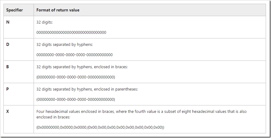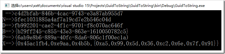 Console.WriteLine("D-->" + System.Guid.NewGuid().ToString("D"));