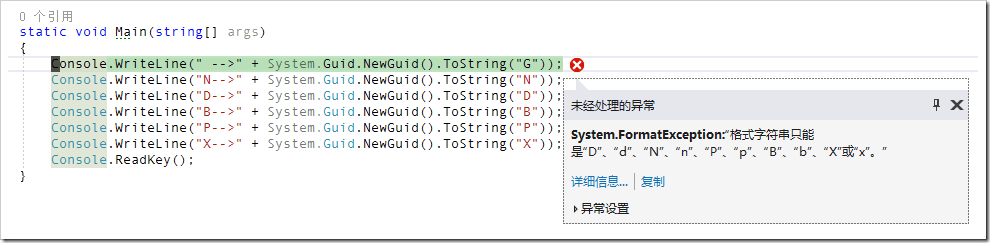 格式字符串只能是“D”、“d”、“N”、“n”、“P”、“p”、“B”、“b”、“X”或“x”。