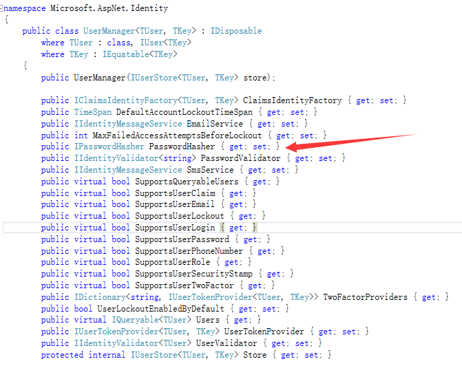 相信了解了MS Identity认证体系的一定知道UserManager的作用,他是整个体系中的调度者,他定义了一套用户行为来帮助我们管理用户信息,角色信息,处理密码等。而其实现则在UserStore当中,我们可以实现其为我们定义的比如IUserStore,IUserPasswordStore,IRoleStore等等. 我们可以基于一整套用户行为,自定义自己的用户信息和数据结构以及数据存储。那么关于Password的Hasher,MS依然为我们提供了完整的行为定义,也由UserManager来调度。比如