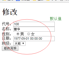 <div>名称:<input type="text" name="sname" value="<?php echo $arr[1]; ?>"/></div> <div>性别: <input type="radio" name="ssex" value="1" <?php echo $arr[2]?"checked='checked'":""; ?>/>男 <!-- 三元运算符,如果性别=ture,默认值就在男上面,否则空--> <input type="radio" name="ssex" value="0" <?php echo $arr[2]?"":"checked='checked'"; ?>/>女 </div> <div>日期:<input type="text" name="sbirthday" value="<?php echo $arr[3]; ?>"/></div> <div>班级:<select name="class">
