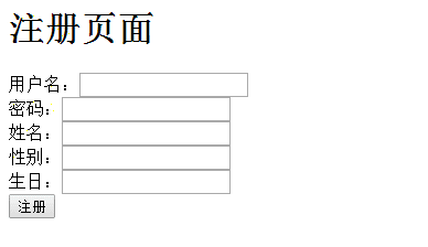 <body > <h1>注册页面</h1> <form action="zhucechuli.php" method="post"> <div>用户名:<input type="text" name="uid"/> </div> <div>密码:<input type="text" name="pwd"/> </div> <div>姓名:<input type="text" name="name"/> </div> <div>性别:<input type="text" name="sex"> </div> <div>生日:<input type="text" name="birthday"> </div> <input type="submit" value="注册"/> </form> </body>