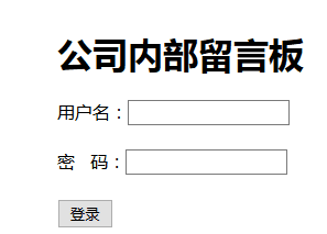 <form action="chuli.php" method="post"> <div style="margin-left: 500px; margin-top: 200px; height: 250px; width: 250px">/*为了把登录表放到页面中间,比较美观*/ <h1>公司内部留言板</h1> <div style="margin-top: 20px">用户名:<input type="text" name="username"/></div><br/> <div>密码:<input type="password" name="password"/></div><br/> <div><input type="submit" value="登录"/></div> </div> </form>