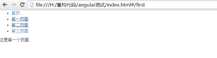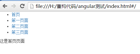 <body> <ul> <li><a href="#/">首页</a></li> <li><a href="#/first">第一页面</a></li> <li><a href="#/second">第二页面</a></li> <li><a href="#/third">第三页面</a></li> </ul> <div ng-view></div> </body>