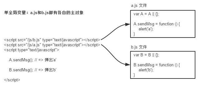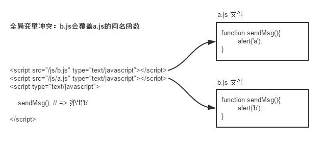 在团队开发或者引入第三方JS文件时,有时会造成全局对象的名称冲突,比如a.js有个全局函数sendMsg() ,b.js也又有个全局函数sendMsg() ,引入a.js和b.js文件时,会造成sendMsg()函数冲突。
