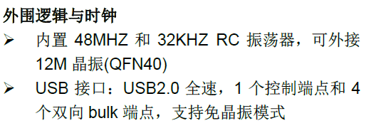 芯片提供了多种外围接口:USB2.0全速、SPI、UART、ISO7816、I2C等,内置ROSC,支持免晶振应用。