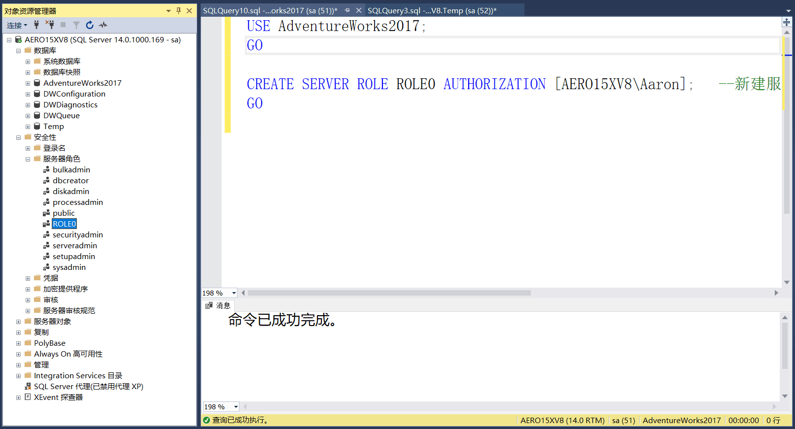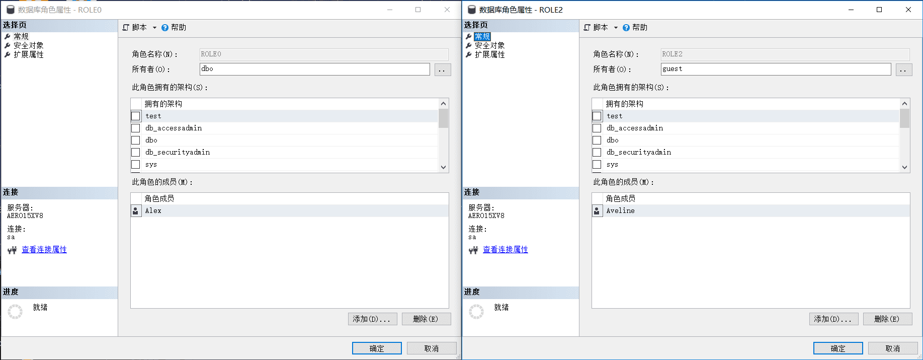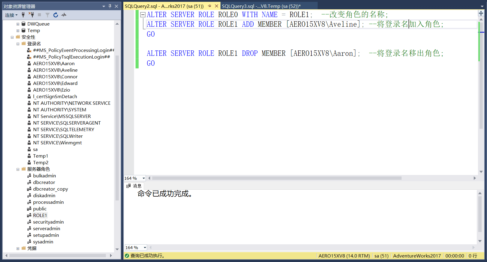 ALTER SERVER ROLE ROLE1 ADD MEMBER [AERO15XV8\Aveline];--将登录名加入角色;